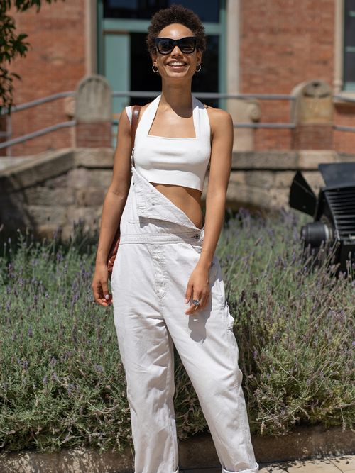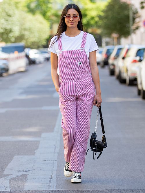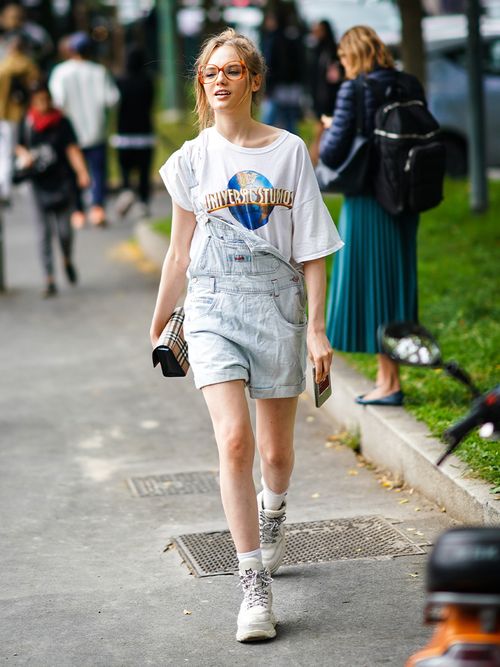 Dit is waarschijnlijk hoe onze moeders de tuinbroek zouden hebben gedragen toen ze in de jaren 80 zwanger waren van ons: met een T-shirt met print en grove sneakers. In onze streetstyle wordt een gesp van de voorzijde aan één kant omgeslagen, waardoor de look een nog nonchalanter karakter krijgt.