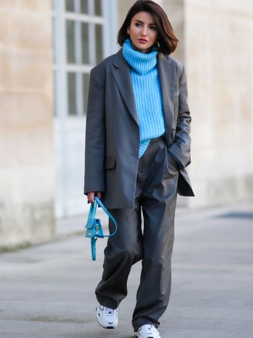 Broekpakken zijn saai..nou nee! Zoals altijd gaat het om de juiste styling. Onze streetstyle bewijst dat zelfs een klassiek grijs broekpak er opwindend uit kan zien. Draag het oversized en combineer het met een dikke coltrui en sneakers.